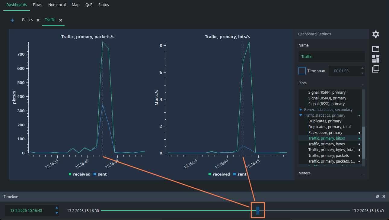 What caused that? Normally, you would need full packet captures to figure it out, but Qosium offers a considerably lighter way to do it. Grab the Timeline pointer and draw it back to the moment of the spike. You see the dashed line in the figures pointing to the place of the timeline: