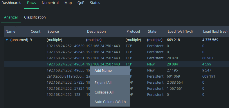 You can name the flows directly in the Classification tab, but let’s go back to the flow view because naming is more illustrative to start there. Pick a flow that you want to name and press the right mouse button on it. A menu appears: select Add Name. You can also double-click a flow row, which automatically moves you to the Classification tab with the flow information pre-filled.