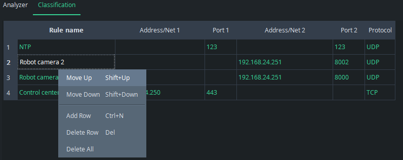 By right-clicking your mouse over the Classification table, a menu appears where you can easily add new rules (Add Row) and delete them (Delete Row). You can also move the places of the rules.