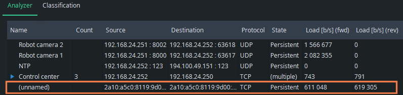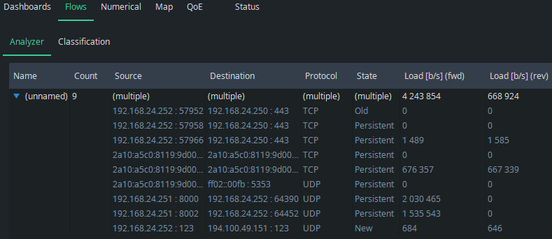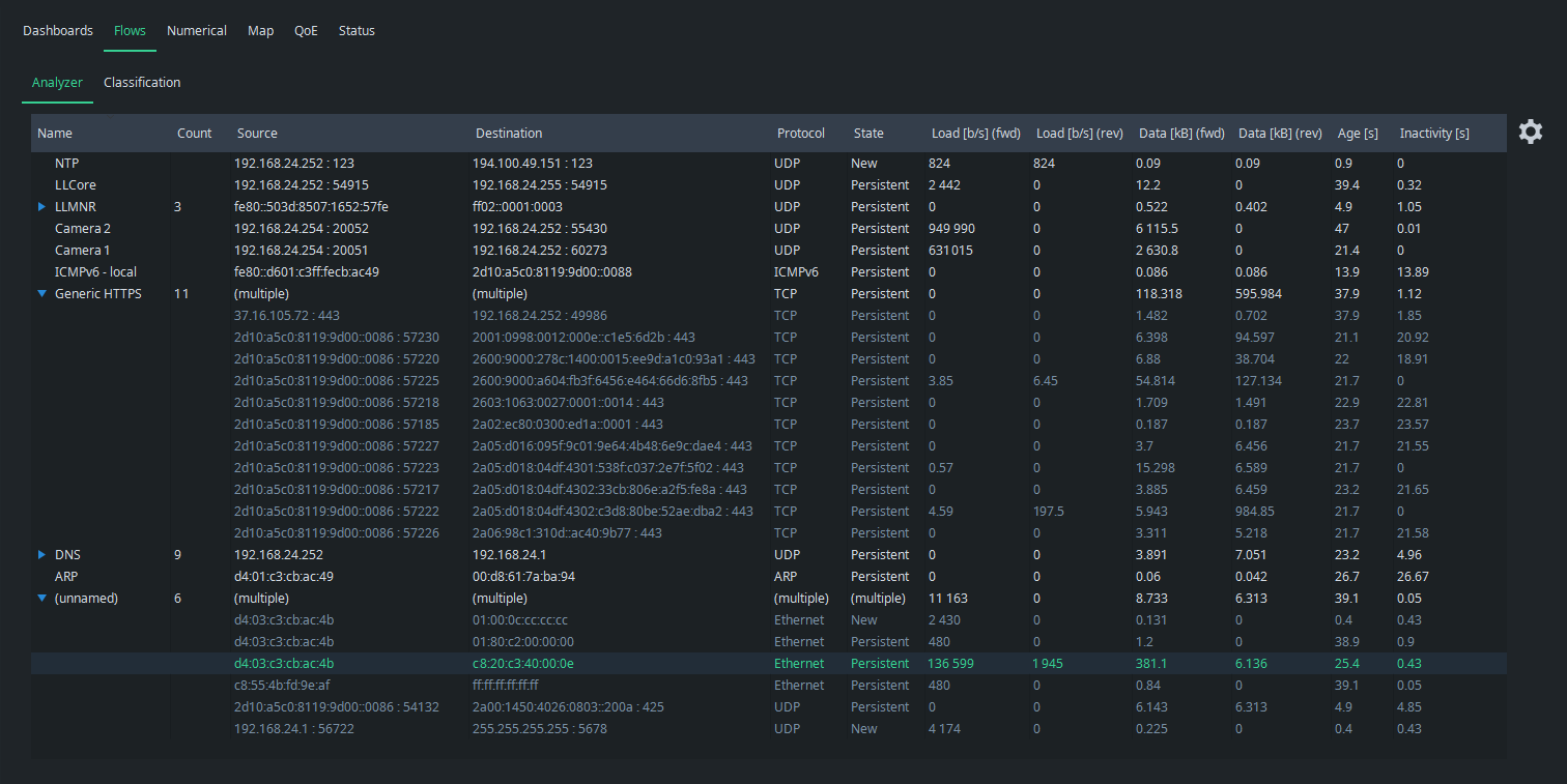 What started as an intricate list of some unknown flows, it all makes sense now. We see all the known flow categories clearly, but there still is one unknown flow. It seems to use IPv6 addressing and weird TCP ports (not shown in the picture). It has continuous traffic in both directions, now about 600 kbit/s. Perhaps it is a factory device we forgot, or has one of the applications or devices started to misbehave somehow? Or maybe it is traffic injected by malware! Whatever it is, it is now easy to check the originating device and the process there. This is one of the main points of flow analysis: know what is being transferred in your network.