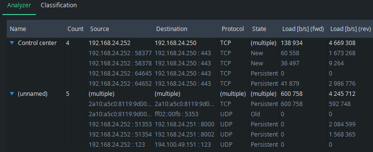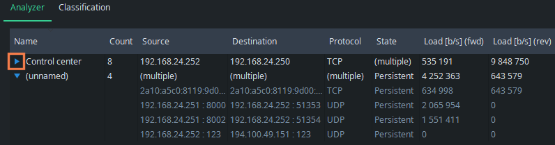 Go back to Analyzer to see the effect: the group of Control center appears with the flows that matched the rule: