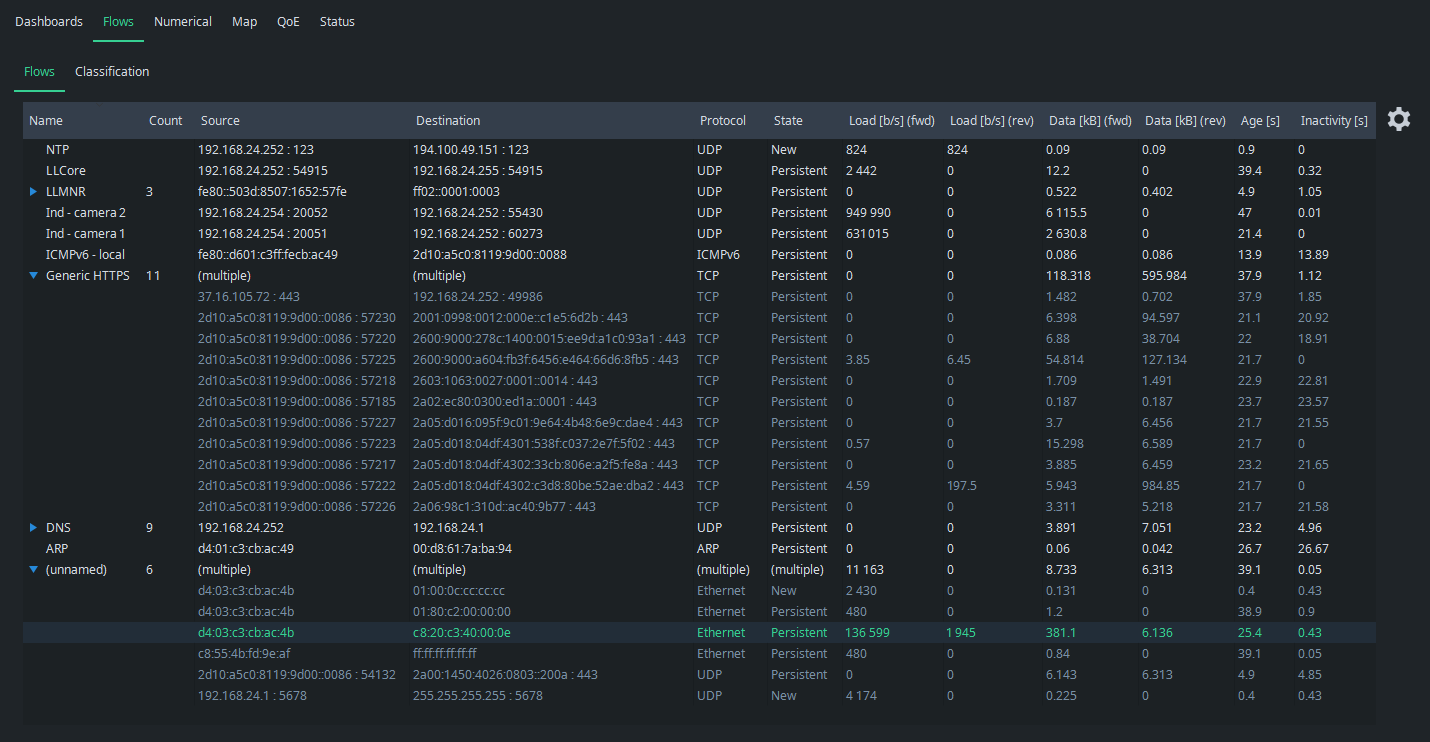 One of the key features is a classification of traffic flows, which brings systematic order to what might initially appear as a chaotic list. You can name flows based on multiple criteria, and flows meeting the same criteria are conveniently grouped under a single label. This allows you to quickly determine, for example, whether the traffic profile of a production network matches expectations.