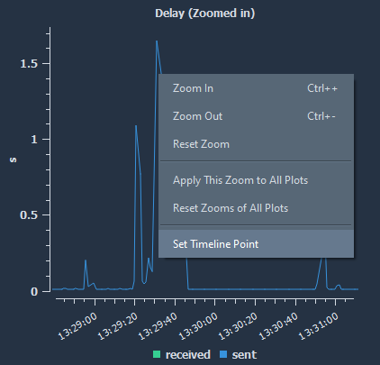 We first zoom in on the delay figure using the mouse scroll wheel. The most interesting spike is the one over 1.5 s, so let’s set the timeline marker there by clicking the right mouse button and selecting: Set Timeline Point.