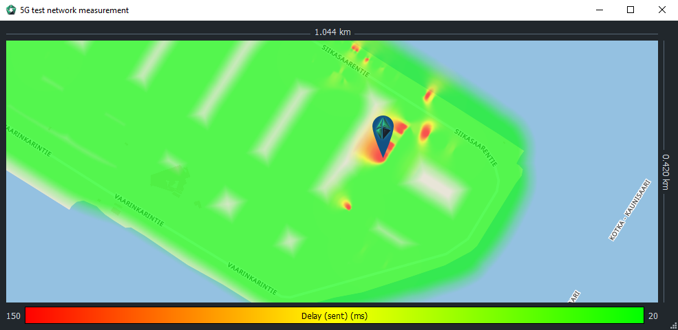 Timeline applies across different views. Thus, let’s go next to the heatmap and visualize, e.g., the delay there. As seen in the figure below, an icon pinpoints Qosium Probe’s location at the timeline marker. You can try to move the timeline marker and see that Probe on the map moves accordingly. This is a handy way to see where the interesting event occurred.